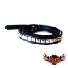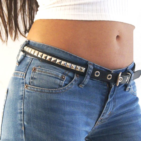 Cinturón de cuero ecológico negro con1 hilera de tacha piramidal 10/10 níquel, pegado y cosido en la parte interior para evitar el desprendimiento de tachas y reforzar su resistencia y densidad. Borde pintado de negro. Ancho de 2cm.