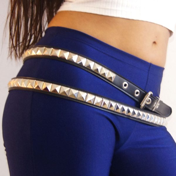 Cinturón de cuero ecológico negro de dos vueltas con 1 hilera de tacha piramidal 15/15 níquel, pegado y cosido en la parte interior para evitar el desprendimiento de tachas y reforzar su resistencia y densidad. Borde pintado de negro. Ancho de 2,5cm.