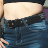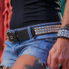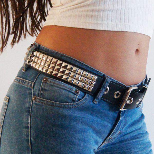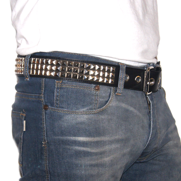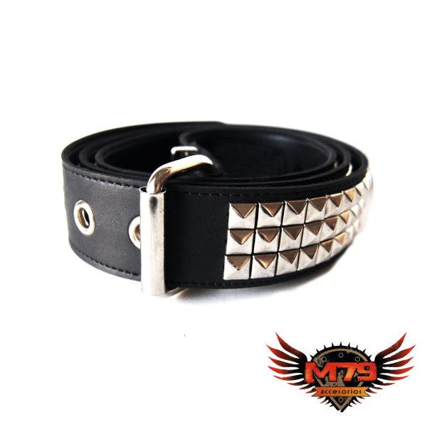 Cinturón de cuero ecológico negro con 3 hileras de tacha piramidal 10/10 níquel, pegado y cosido en la parte interior para evitar el desprendimiento de tachas y reforzar su resistencia y densidad. Borde pintado de negro. Ancho de 4cm.