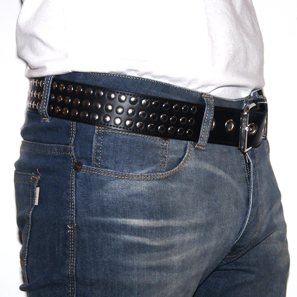 Cinturón de cuero ecológico negro con 3 hileras de remache 8/8 níquel, pegado y cosido para reforzar su resistencia y densidad.
