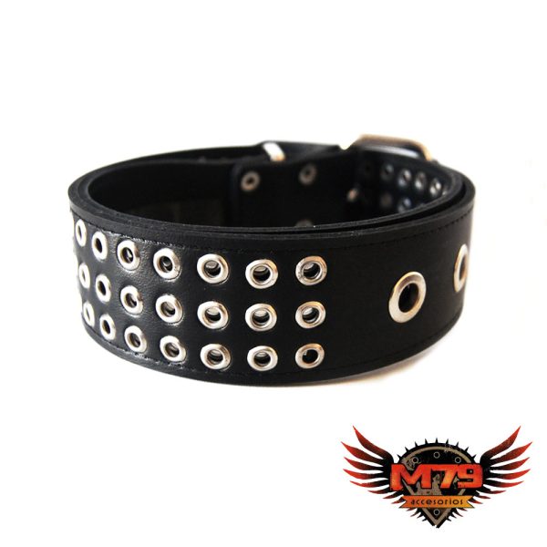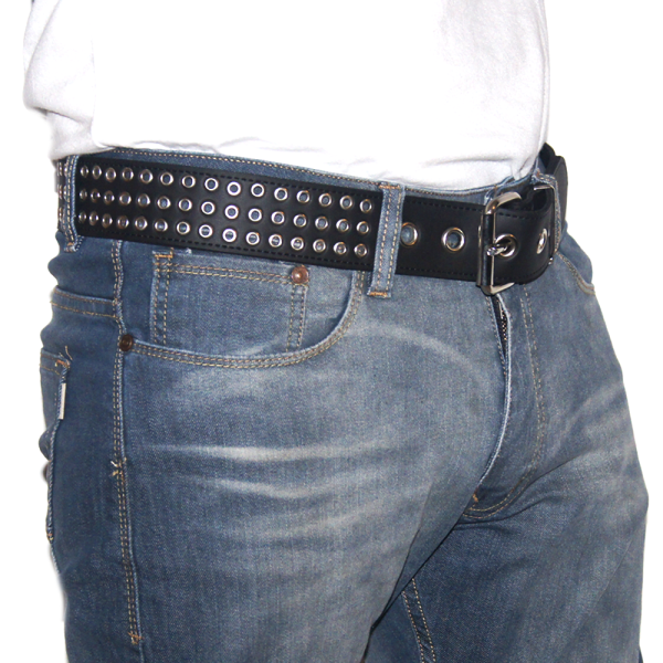 Cinturón de cuero ecológico negro con 3 hileras de ojal 450 níquel, pegado y cosido para reforzar su resistencia y densidad.
