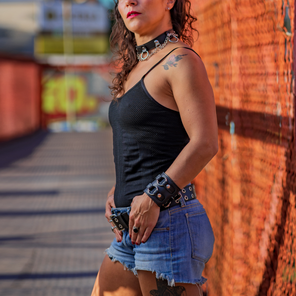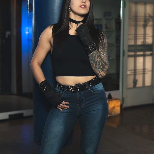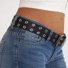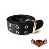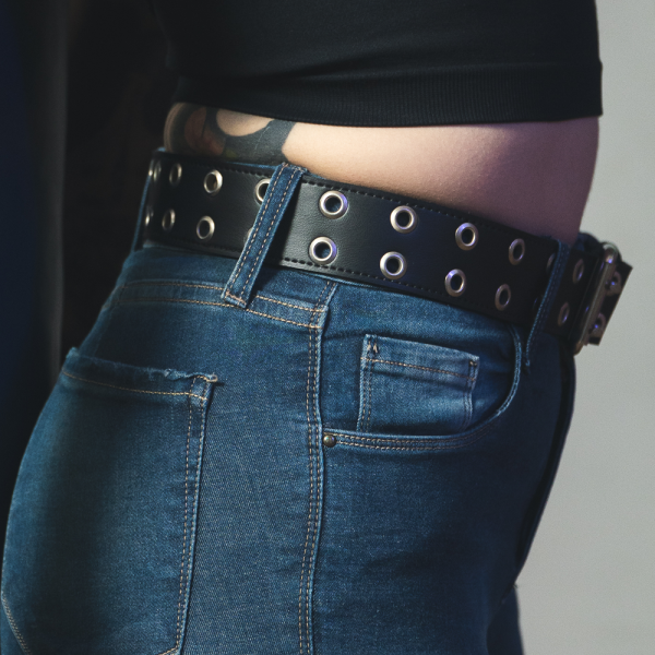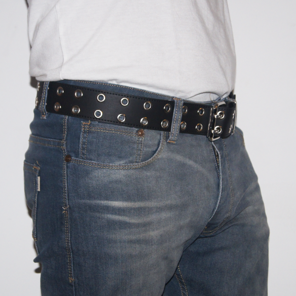 Cinturón de cuero ecológico negro con 2 hileras ojal 1100 níquel, pegado y cosido para reforzar su resistencia y densidad.