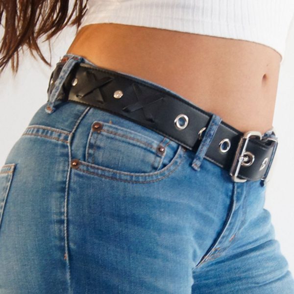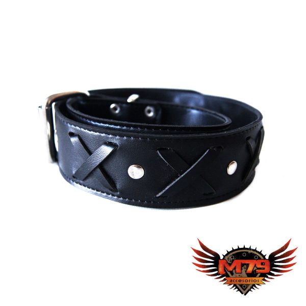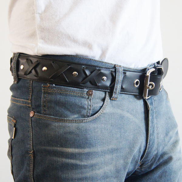 Cinturón de cuero ecológico negro con tiras cruzadas y remachadas del mismo material, pegado y cosido para reforzar su resistencia y densidad.