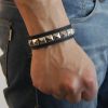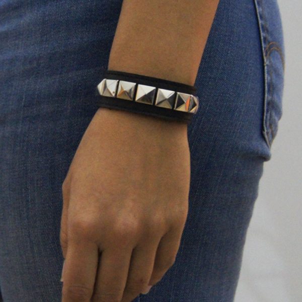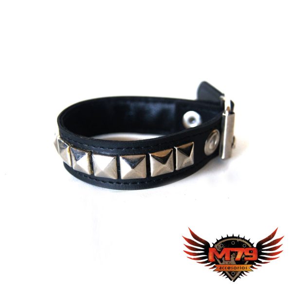 Muñequera de cuero ecológico negro con 1 hilera de tacha piramidal 10/10 níquel, de 2 cm de ancho.