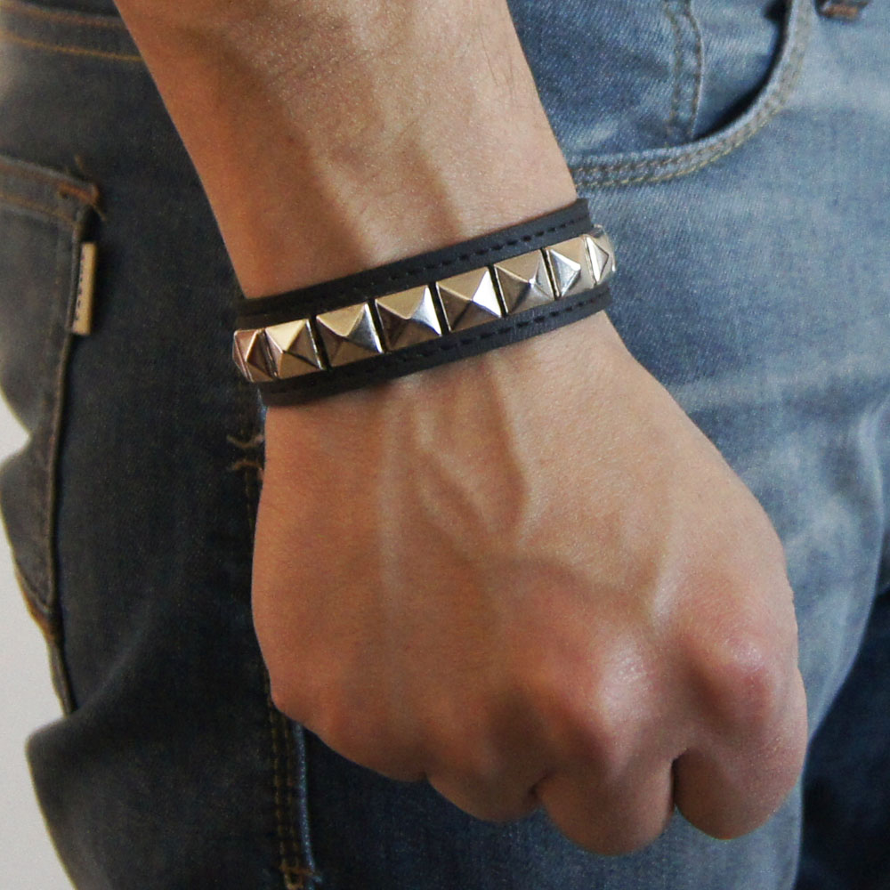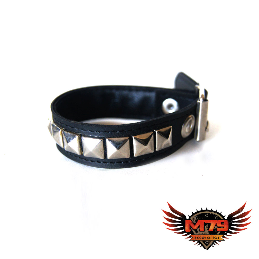 Muñequera de cuero ecológico negro con 1 hilera de tacha piramidal 10/10 níquel, forrada y cosida en la parte interior para evitar el desprendimiento de tachas.