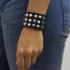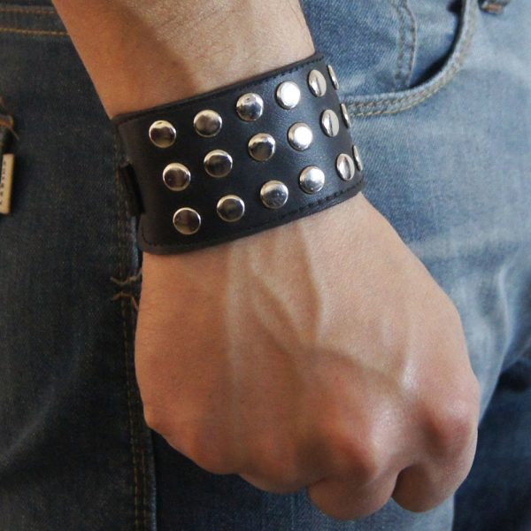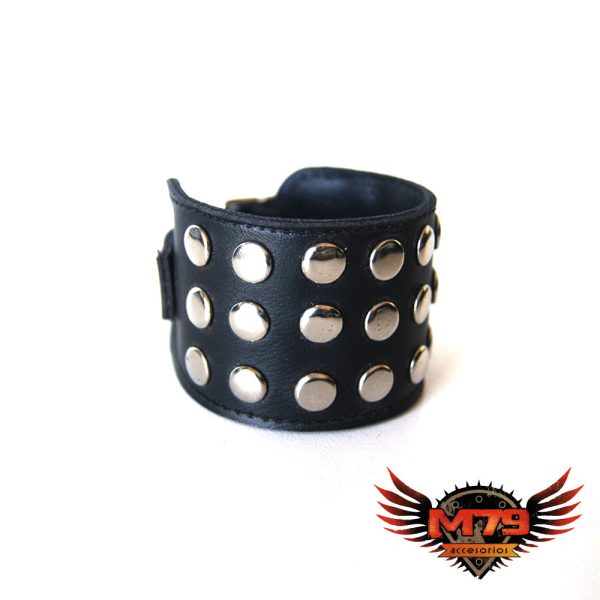 Muñequera de cuero ecológico negro con 3 hileras de remache 8/8 níquel, forrada y cosida en la parte interior.