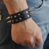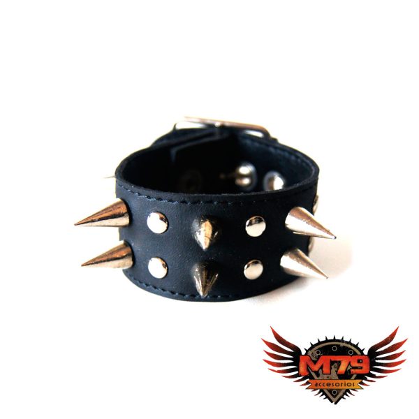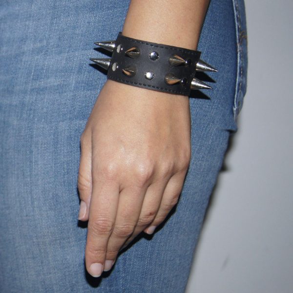 Muñequera de cuero ecológico negro con 2 hileras de púa 12 alternada con remache 6/6 níquel, forrada y cosida en la parte interior para mayor flexibilidad y resistencia.