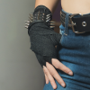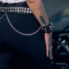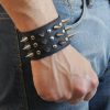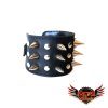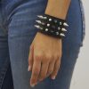 Muñequera de cuero ecológico negro con 3 hileras de púa 12 alternada con remache 6/6 níquel, forrada y cosida en la parte interior para mayor flexibilidad y resistencia.