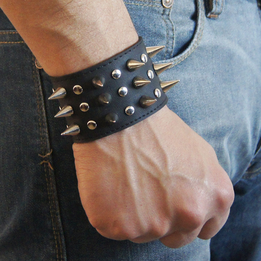Muñequera de cuero ecológico negro con 3 hileras de púa 12 alternada con remache 6/6 níquel, de 4,5 cm de ancho.