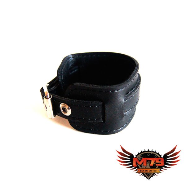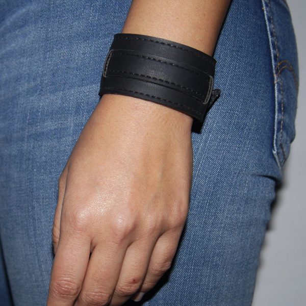 Muñequera de cuero ecológico negro con 1 tira, pegada y cosida para mayor resistencia.