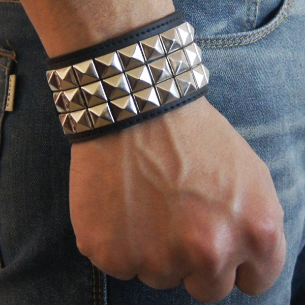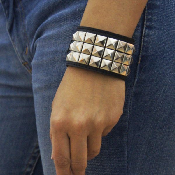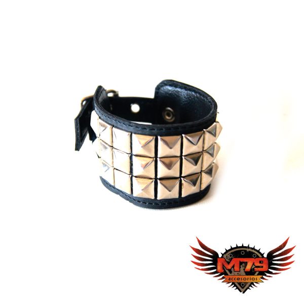 Muñequera de cuero ecológico negro con 3 hileras de tacha piramidal 10/10 níquel, forrada y cosida en la parte interior para evitar el desprendimiento de tachas.