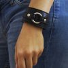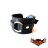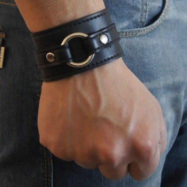 Muñequera de cuero ecológico negro con 1 argolla 20/4 níquel, pegada y cosida para mayor resistencia.