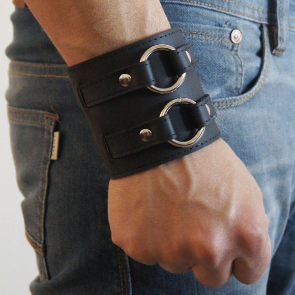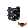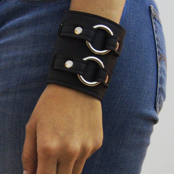 Muñequera de cuero ecológico negro con 2 argollas 20/4 níquel, pegada y cosida para mayor resistencia.