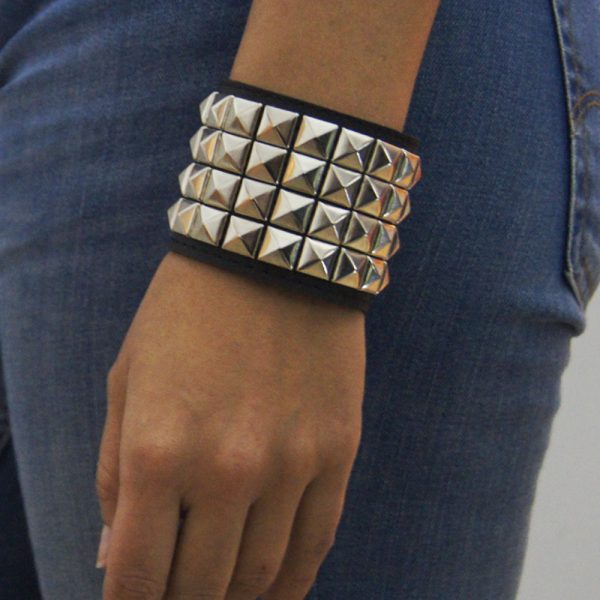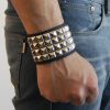 Muñequera de cuero ecológico negro con 4 hileras de tacha piramidal 10/10 níquel, de 5 cm de ancho.