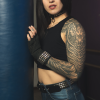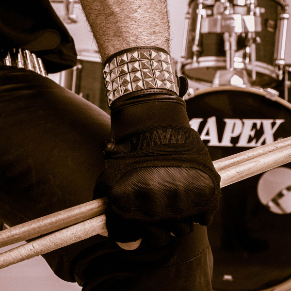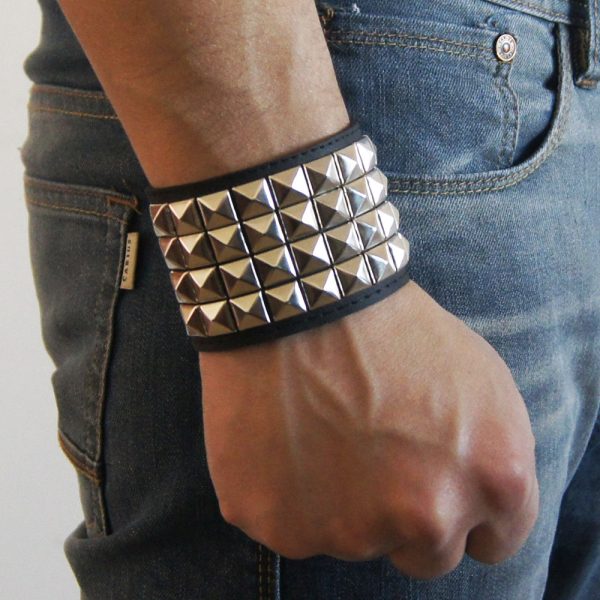 Muñequera de cuero ecológico negro con 4 hileras de tacha piramidal 10/10 níquel, forrada y cosida en la parte interior para evitar el desprendimiento de tachas.