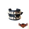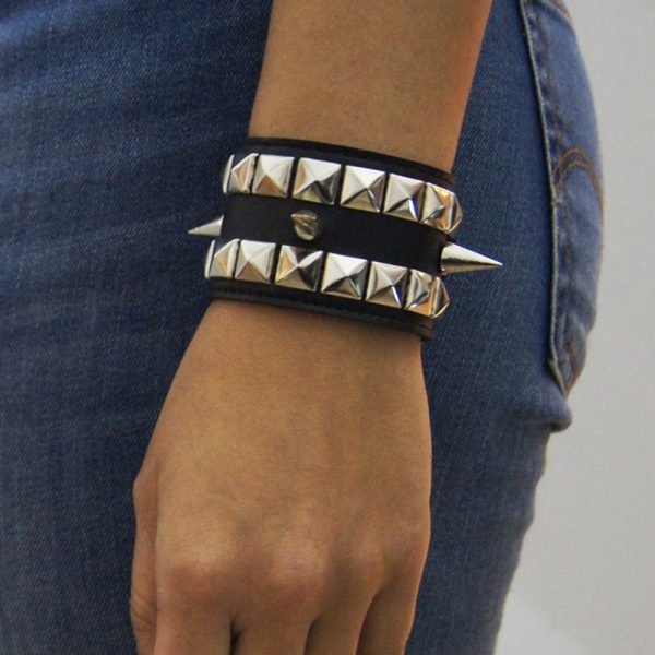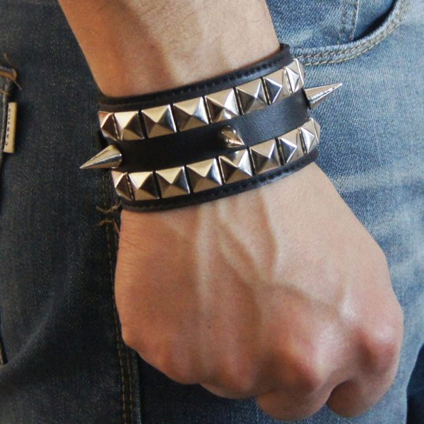 Muñequera de cuero ecológico negro con 2 hileras de tacha piramidal 10/10 níquel al borde y una hilera de púa 12 en el centro, forrada y cosida en la parte interior para evitar el desprendimiento de tachas. Bordes pintados de negro. Ancho 4cm.