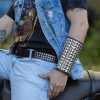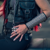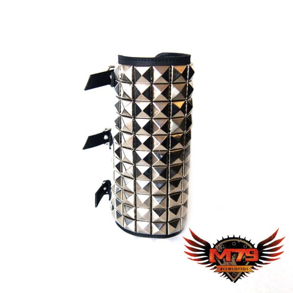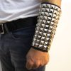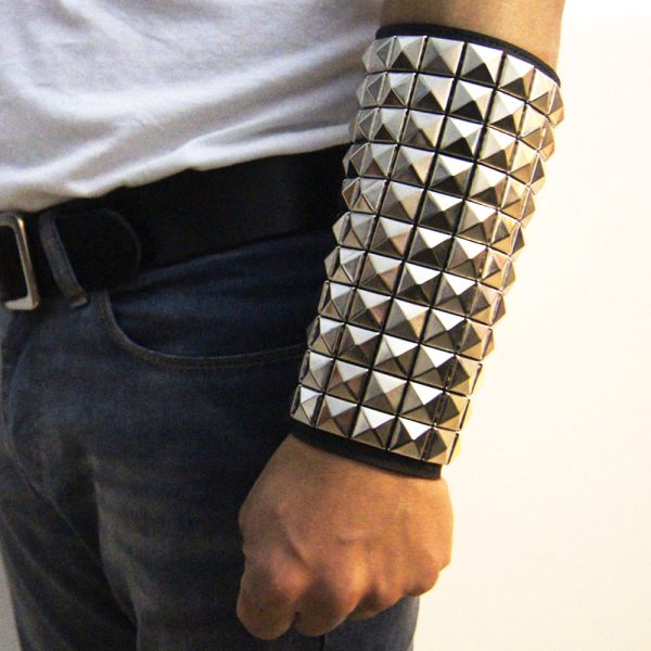 Antebrazo de cuero ecológico negro con 11 filas de tacha piramidal 15/15 níquel, forrada y cosida en la parte interior para evitar el desprendimiento de tachas.