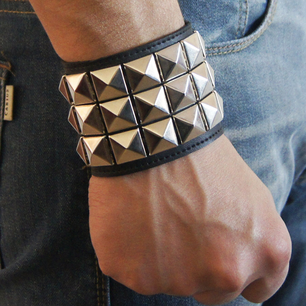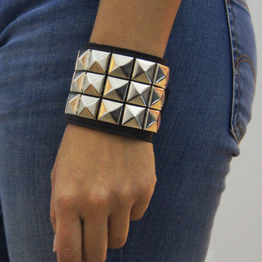 Muñequera de cuero ecológico negro con 3 hileras de tacha piramidal 15/15 níquel, forrada y cosida en la parte interior para evitar el desprendimiento de tachas.