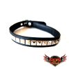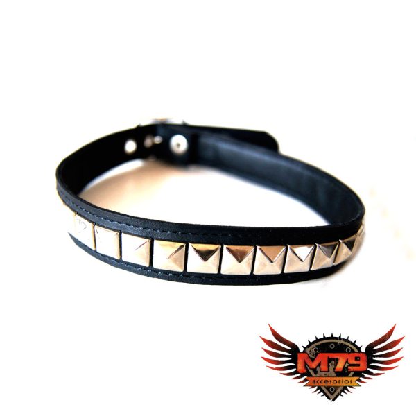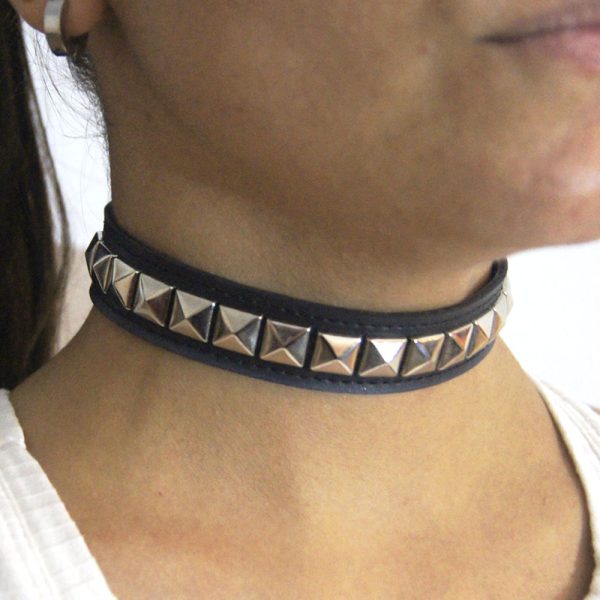 Gargantilla de cuero ecológico negro con 1 hilera de tacha piramidal 10/10 níquel, forrada y cosida en la parte interior para evitar el desprendimiento de tachas.