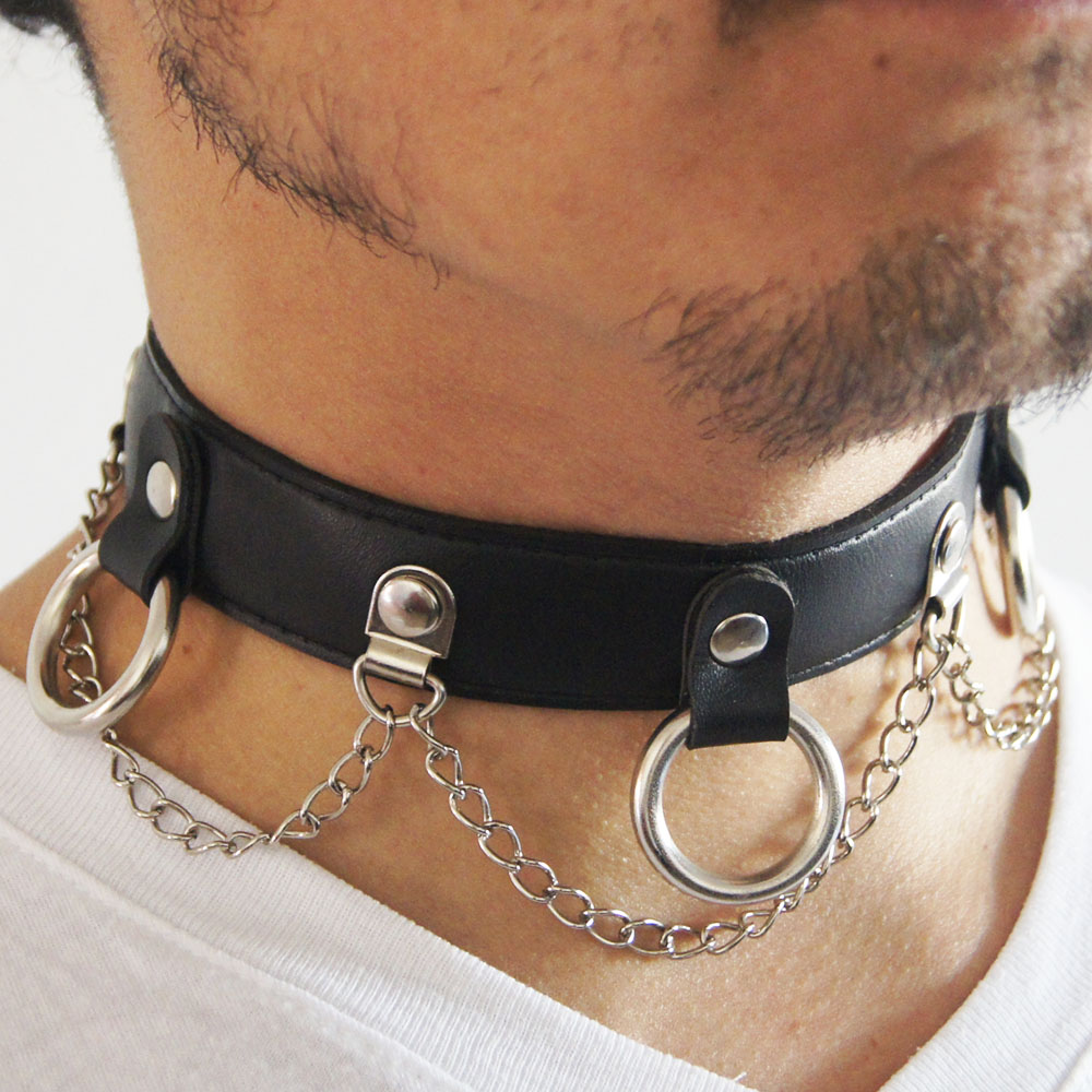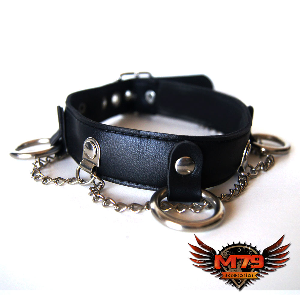 Gargantilla de cuero ecológico negro con 1 hilera de argollas níquel, pegada y cosida para mayor resistencia, con 3 cadenas volcadas. Bordes pintados de negro. Ancho 2,5cm.