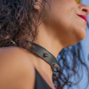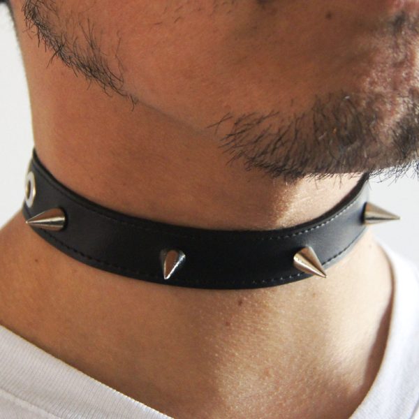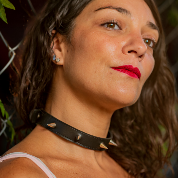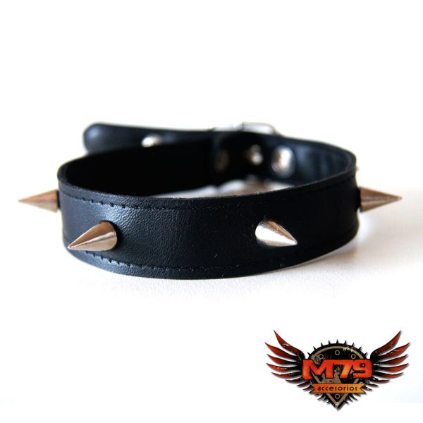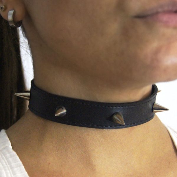 Gargantilla de cuero ecológico negro con 1 hilera de púas 12 níquel, forrada y cosida en la parte interior para mayor flexibilidad y resistencia.