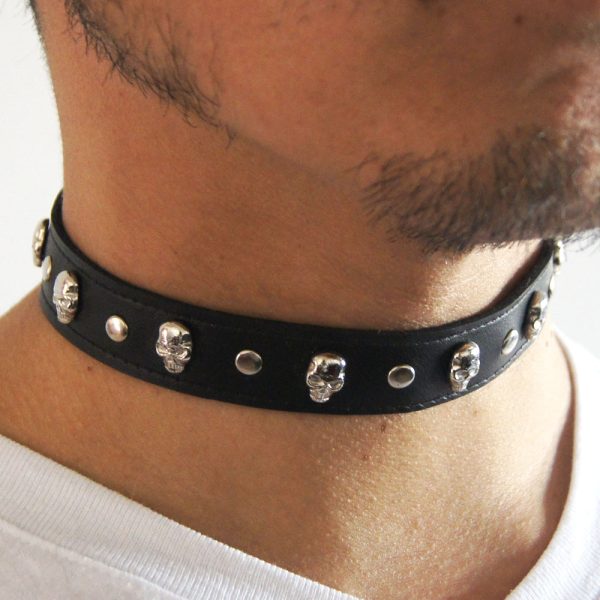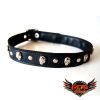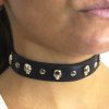 Gargantilla de cuero ecológico negro con 1 hilera de cráneo chico alternado con remache 6/6 níquel, forrada y cosida en la parte interior para mayor flexibilidad y resistencia.