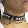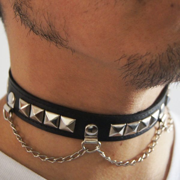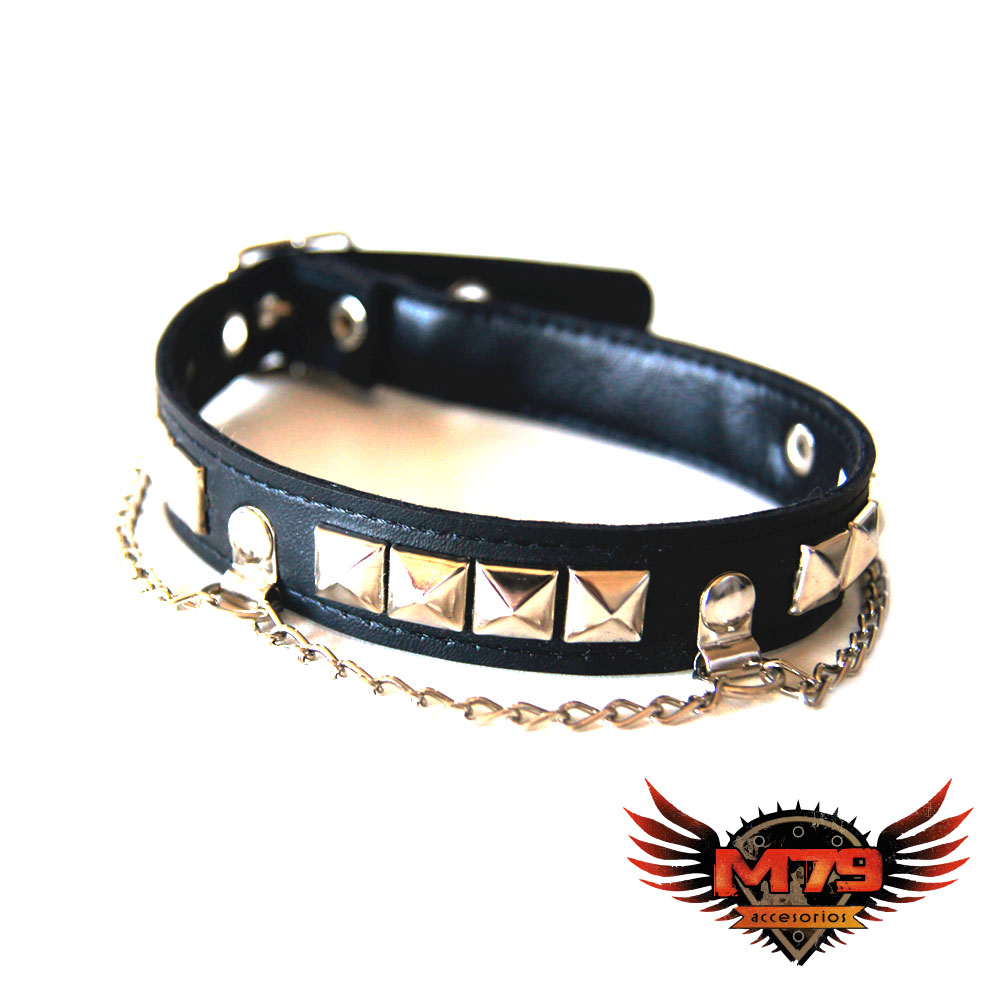 Gargantilla de cuero ecológico negro con 1 hilera de tacha piramidal 10/10 níquel, forrada y cosida en la parte interior para evitar el desprendimiento de tachas, con 3 cadenas volcadas.