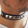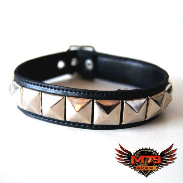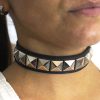 Gargantilla de cuero ecológico negro con 1 hilera de tacha piramidal 15/15 níquel, forrada y cosida en la parte interior para evitar el desprendimiento de tachas.